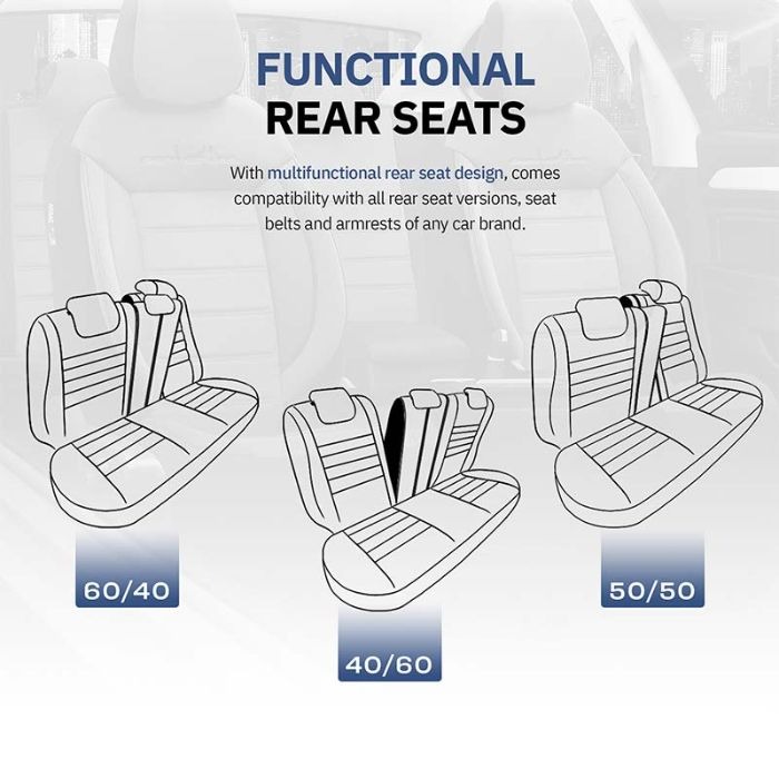 Съвместими с повечето модели автомобили: Благодарение на технология на формоване AEROFIT и технологии застегивания на ципа, напълно съвместима с всички леки и офроуд автомобили, напълно адаптирани към предпазните колани, подлакътниците и функцията за сгъване на задната седалка.